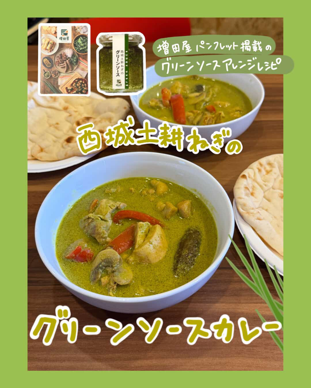 詳しいレシピは増田屋のパンフレット、インスタグラム、ホームページでもご紹介しています。グリーンソースの新しい楽しみ方として、ぜひお試しください!