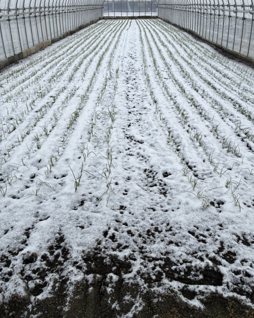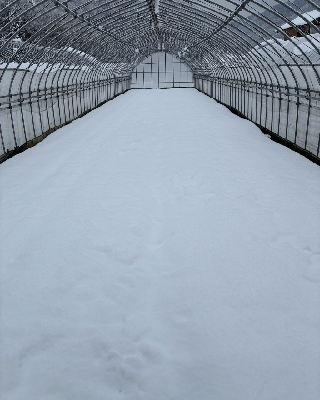 年明け以降、庄原市西城町では何度かの積雪があり、冬本番の厳しい寒さが続きました。積雪冷地に指定されているこの地域では、冬季はハウスのビニールを巻き上げた状態で管理します。そのため、12月に定植した苗は、翌3月半ばごろまで、積もった雪の下で眠るように冬を過ごすことになります。