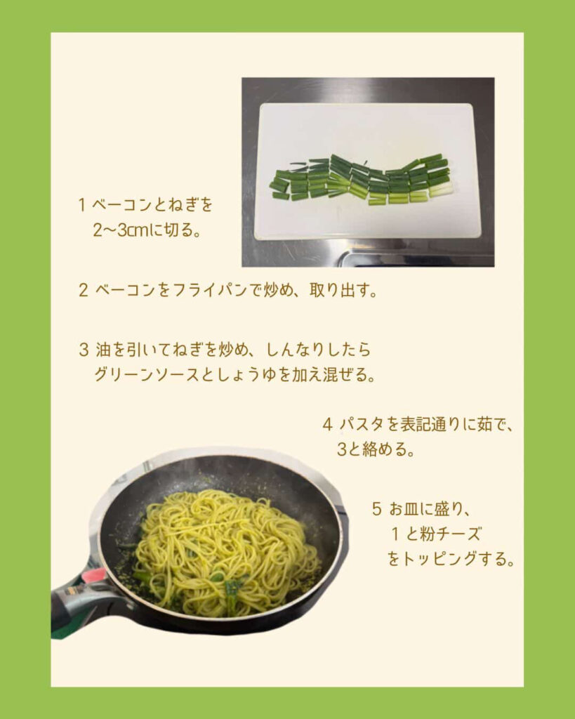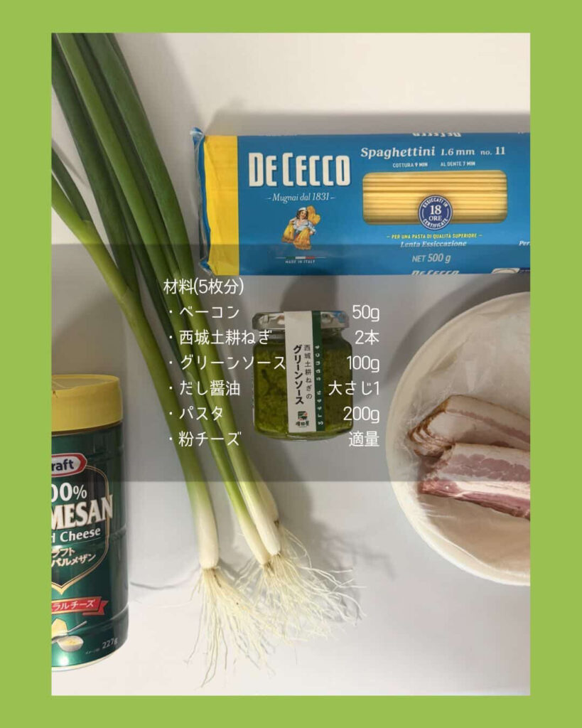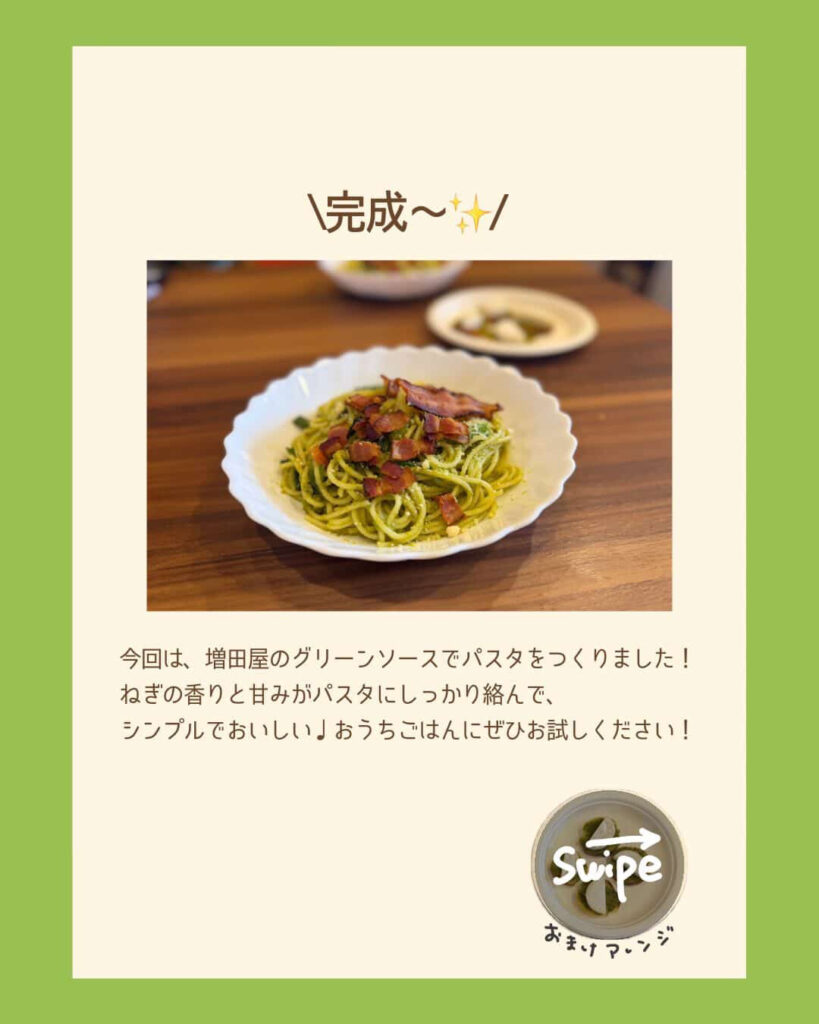 そして今回が、いよいよ最後の増田屋商品を使ったアレンジレシピとなりました。西城土耕ねぎのグリーンソースを使った「グリーンソースパスタ」です。